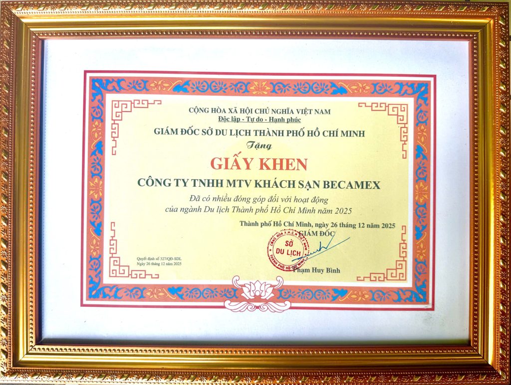 On December 30, 2025, at Rex Hotel Saigon, Becamex Hotel was honored to receive a Certificate of Merit from the Ho Chi Minh City Department of Tourism for its significant contributions to the city’s tourism industry in 2025.