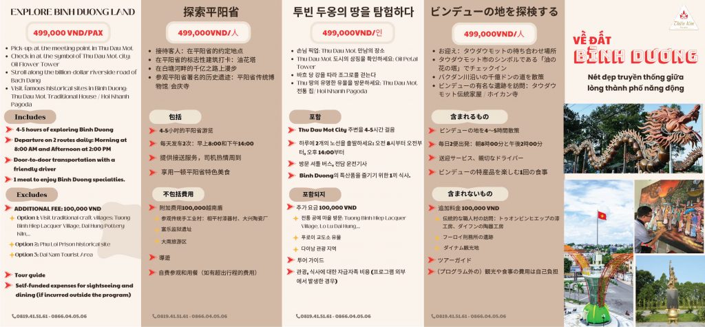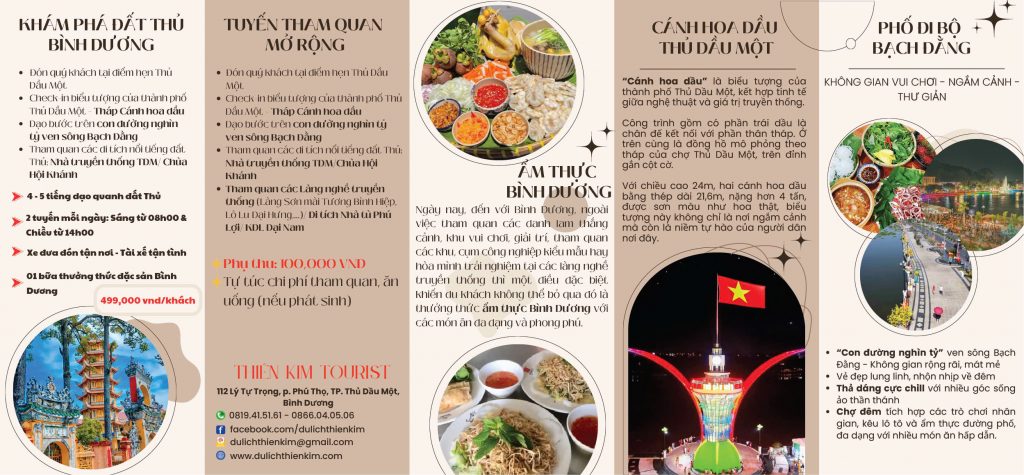 Công ty du lịch Thiên Kim chính thức phục vụ tour du lịch nửa ngày đầu tiên nhằm quảng bá du lịch Bình Dương và nâng cao trải nghiệm của du khách, khám phá văn hóa bản địa và hòa cùng với người dân để được tận hưởng vẻ đẹp của đất nước, con người nơi đây. Tour du lịch hằng ngày này được hỗ trợ bởi Trung tâm xúc tiến văn hóa du lịch Bình Dương và Hiệp hội du lịch Bình Dương. Cơ hội giới thiệu đến bạn bè đối tác để họ cảm nhận nhiều hơn về quê hương Bình Dương thân yêu nhé.